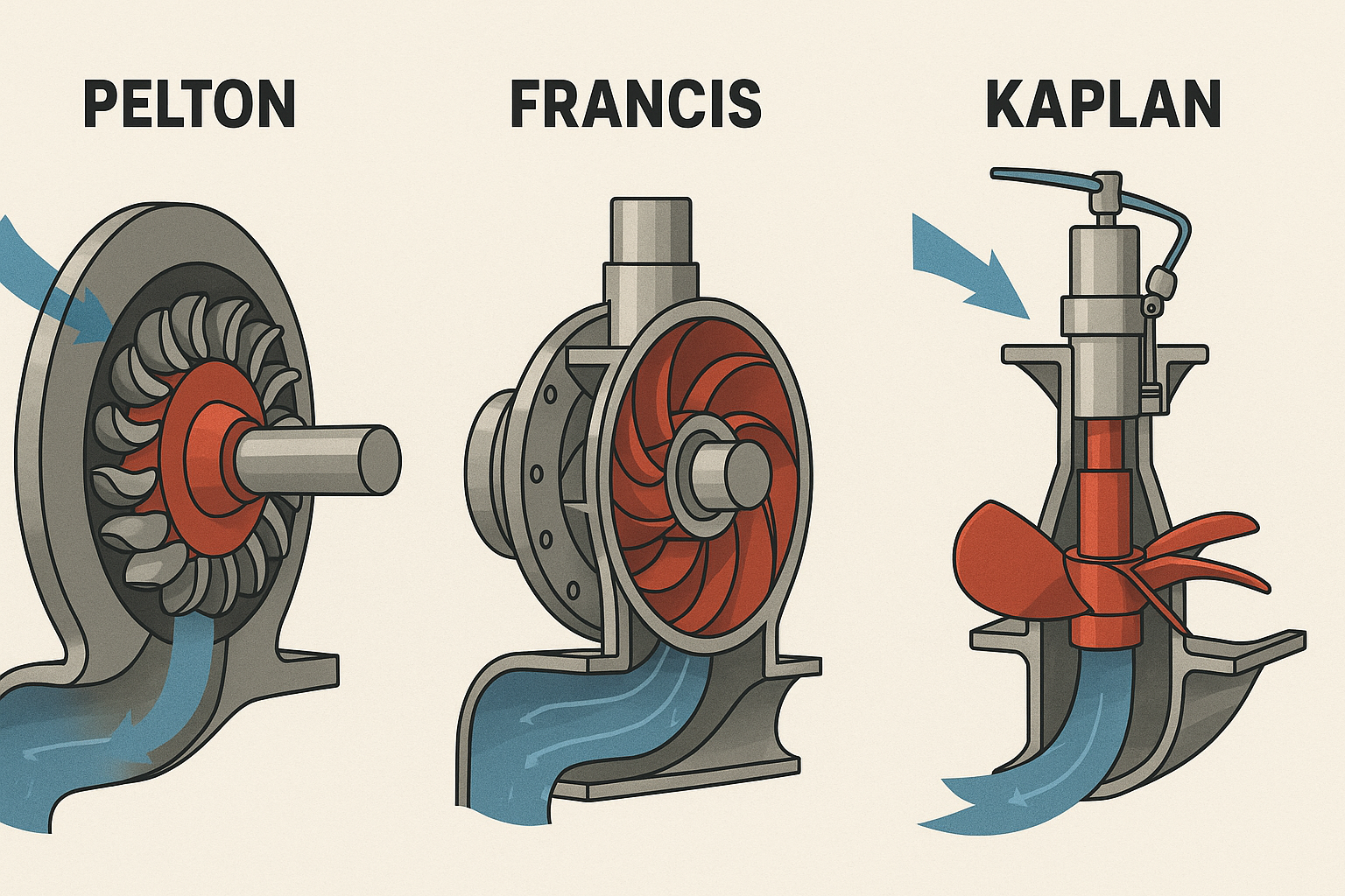 Nel settore idroelettrico esistono diverse tipologie di turbine usate per generare energia pulita, tra cui le più utilizzate sono le Pelton, le Francis e le Kaplan. La scelta dipende principalmente dal tipo di salto idraulico e dal volume d’acqua disponibile.