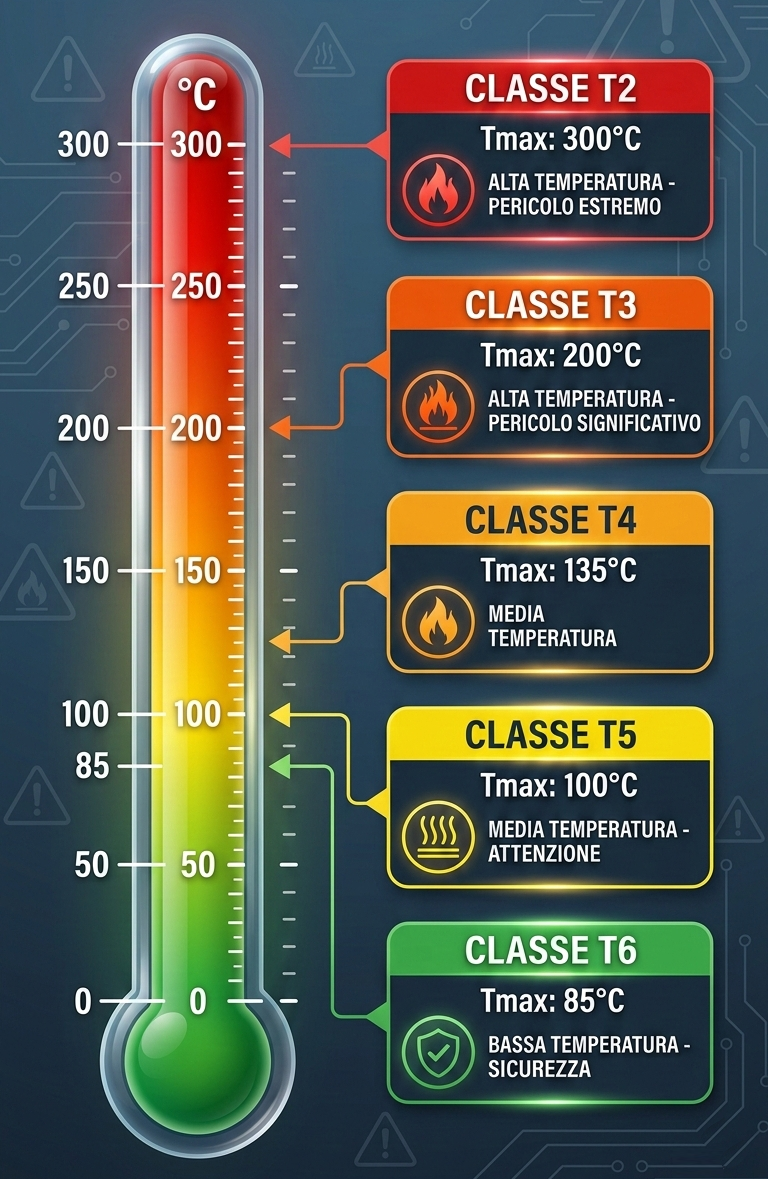 La norma EN 1127-1 (§ 6.4.2) stabilisce i margini di sicurezza: per gas e vapori, la temperatura operativa massima non deve superare l'80% della temperatura minima di accensione dell'atmosfera presente. Per le polveri, il limite scende a 2/3.